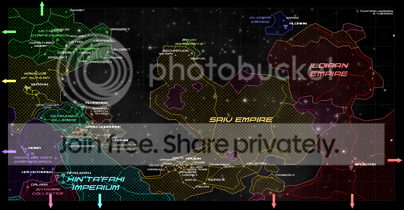Isharo Cerillo united the planet's five nations in the 650s, forming the Saiv Empire. Ravion succeeded it's "bootstrap" space development in 662 A.D. when it entered the interstellar age, connecting various colonies formed earlier by a realspace exodus. The Saiv population on Ravion numbered slightly over 5 billion at this time. Soon, the Empire began subjugating neighbouring backwater worlds and toppling interstellar civilisations alongside further colonisation. By 2130 A.D., the Saiv sphere of influence measured 220 ly between it's two most distant points, and housed almost 20 billion Saiv and 5 subject species.