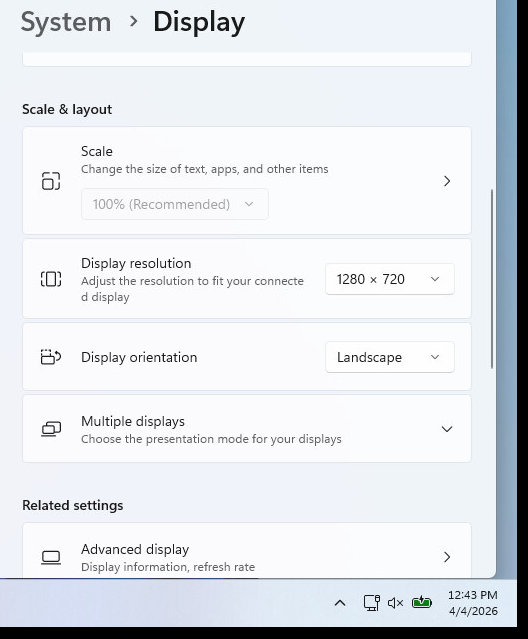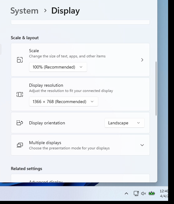 When my laptop is used as a secondary, the right side of the screen is truncated when using the recommended display size setting. Changing the setting to the next size smaller results in a full display in MP4.
