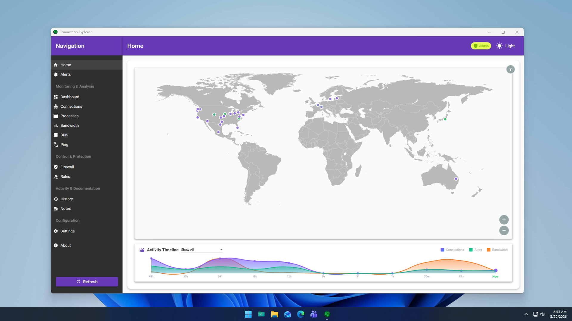 - Activity Timeline: A historical view of your connections, bandwidth usage, and active apps over time