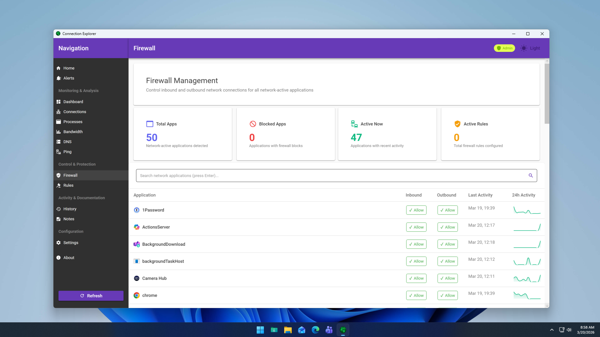 With the 1.0 release, Connection Explorer expands on this vision with an all-new activity timeline that provides a historical view of connections, bandwidth usage, and the number of applications actively communicating. Combined with per-application bandwidth monitoring, users can now quickly identify which apps are consuming resources and how their network activity changes over time.