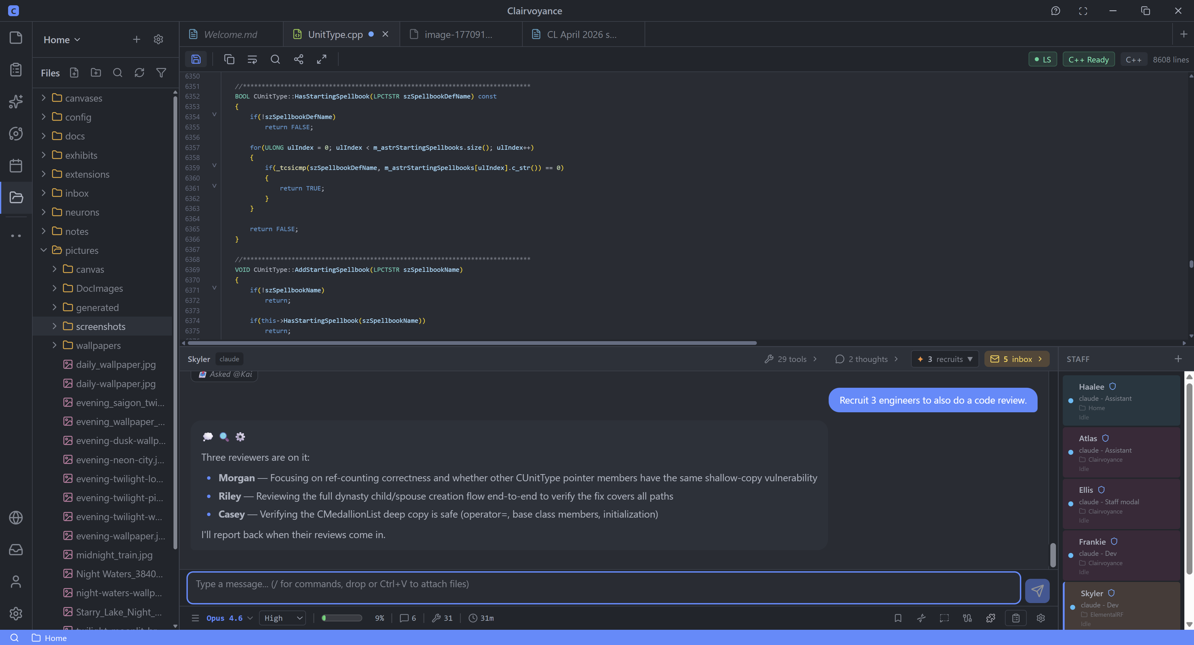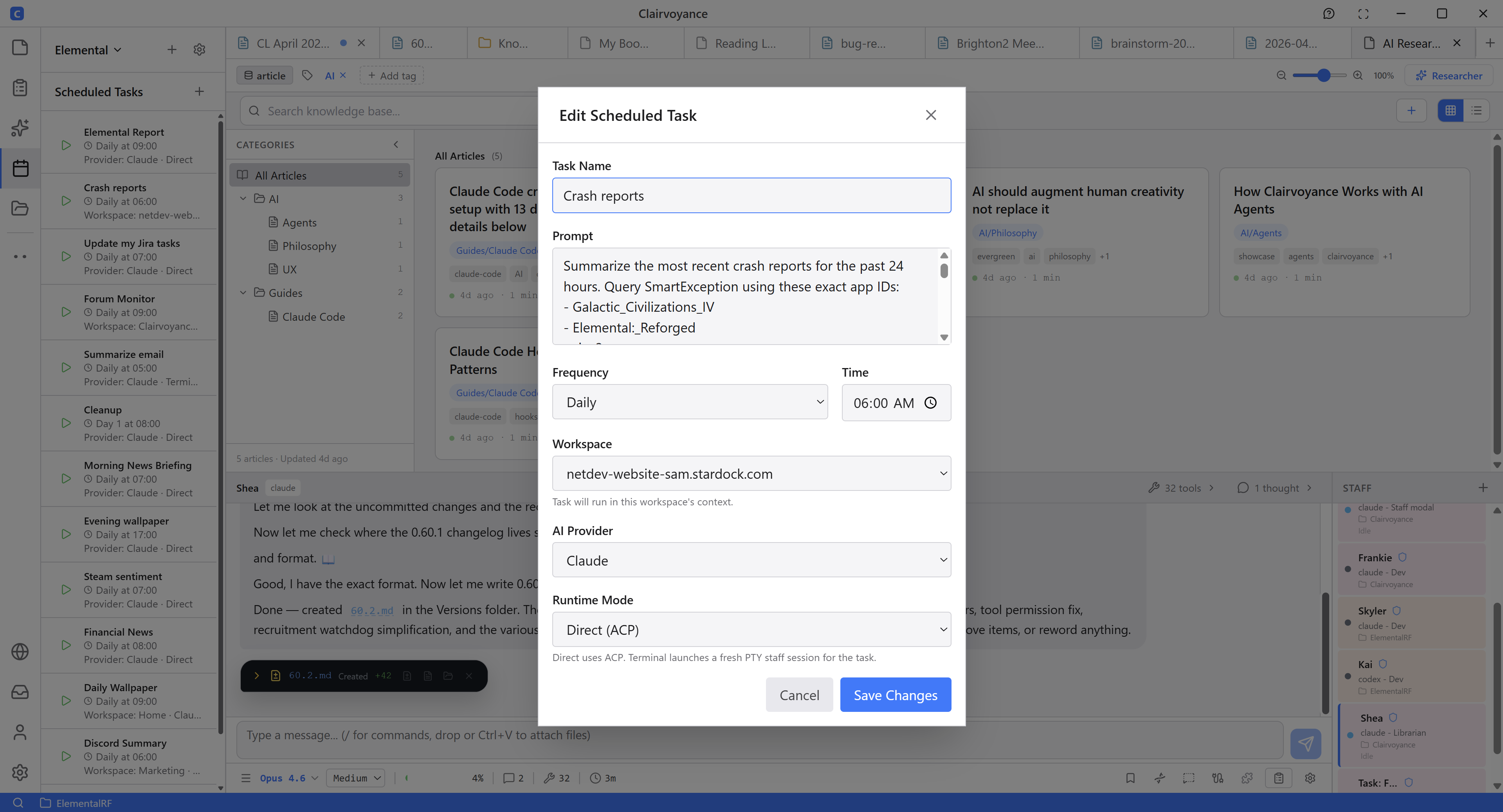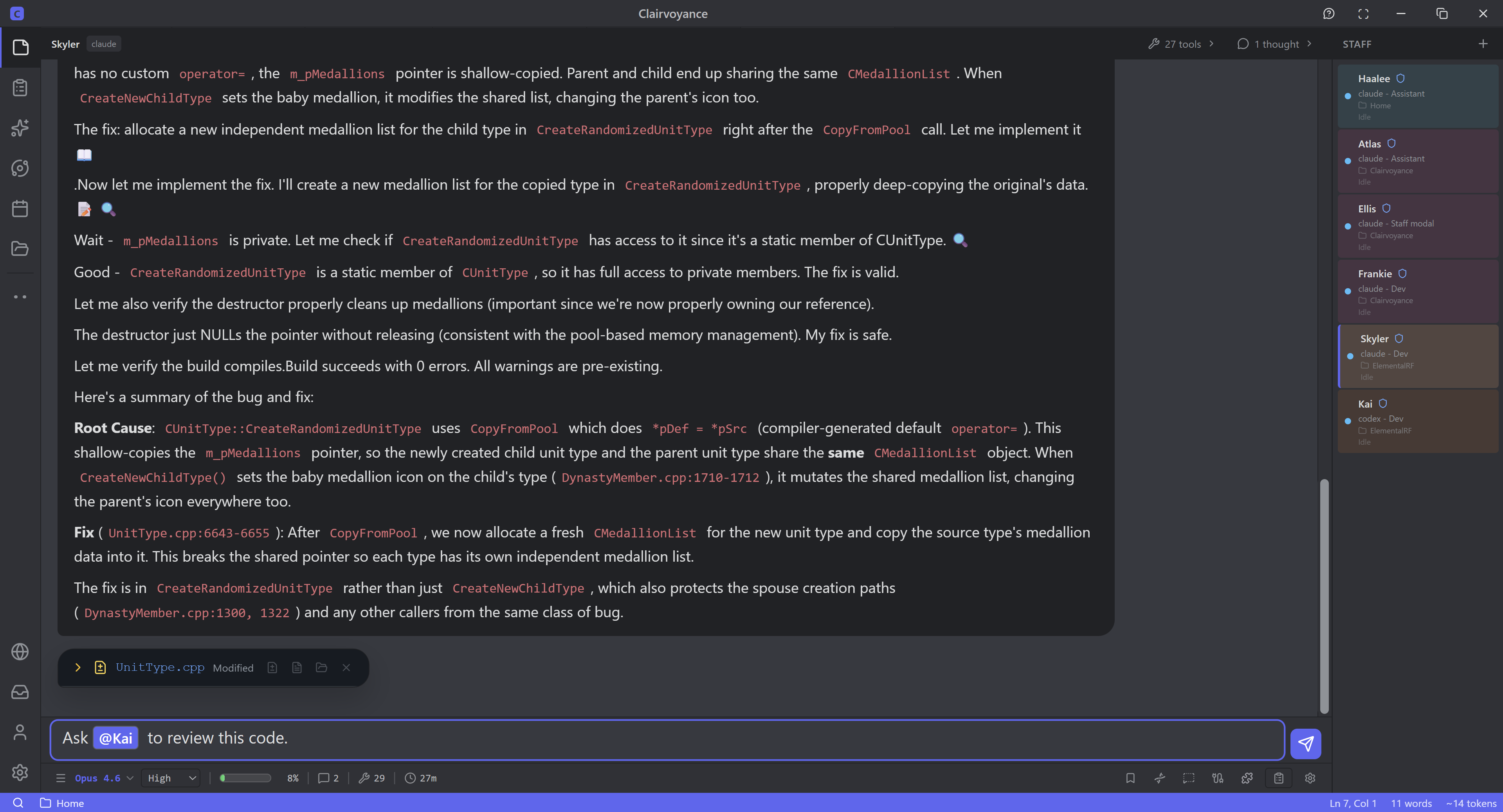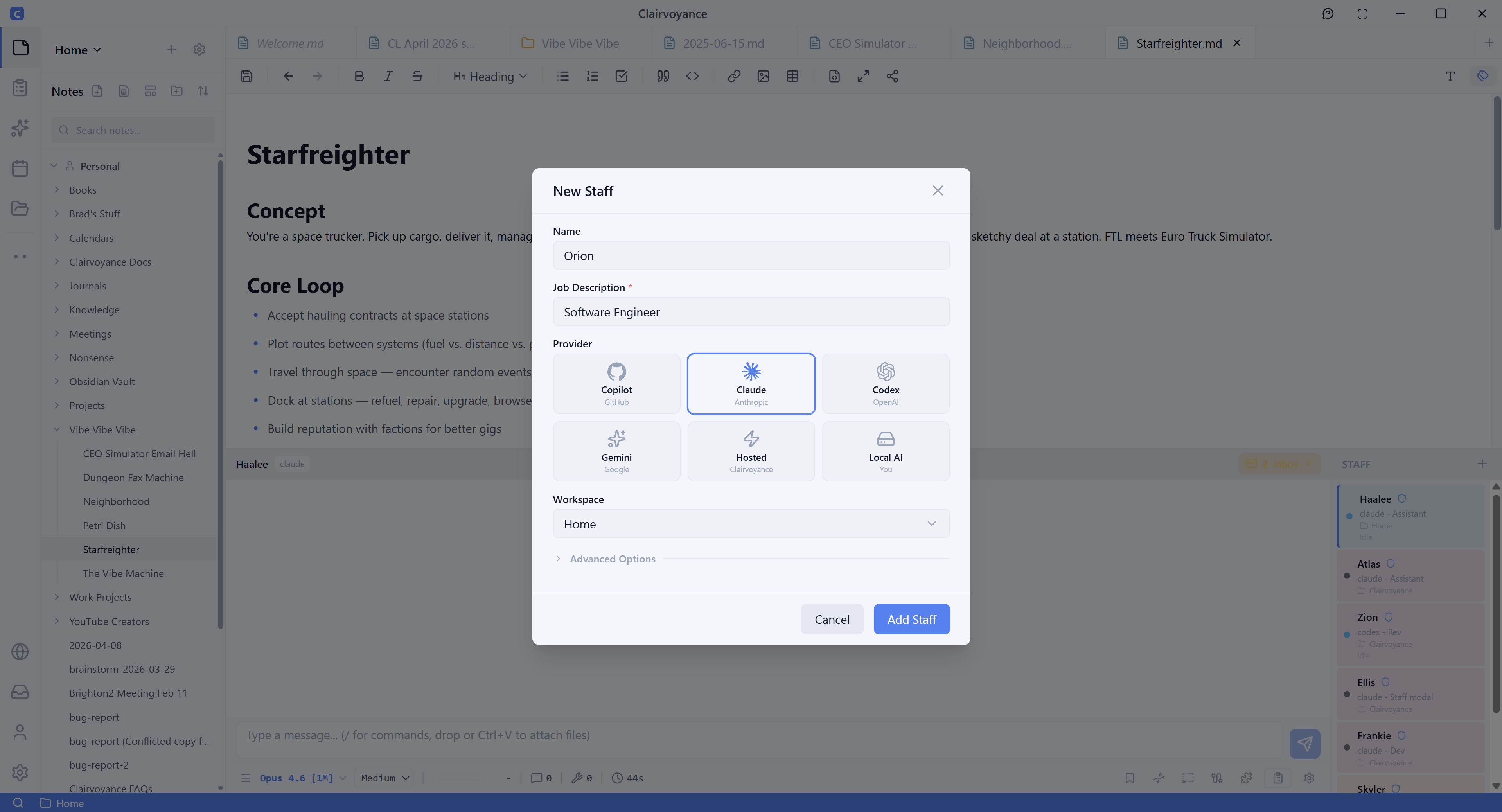 Today we released Beta 1 of Clairvoyance, our AI management application and it's free for anyone to download. If you missed the alpha: Clairvoyance gives you persistent AI staff that live on your machine, learn your projects, and work like employees. You pick your AI provider, assign staff to workspaces, and they get to work. They remember context between sessions, work with your local files, and operate through Agent Communication Protocol (ACP) so your data stays on your machine.